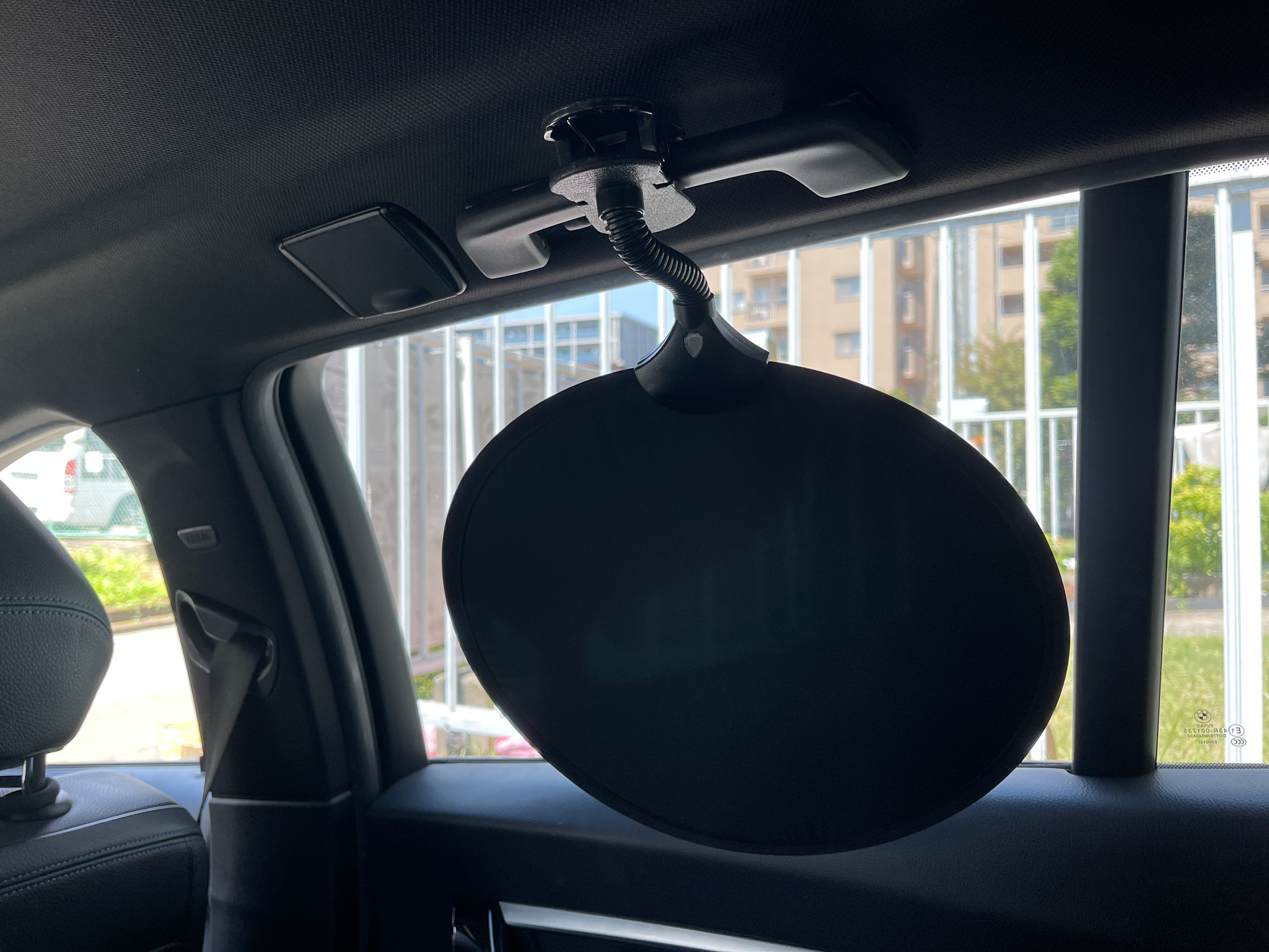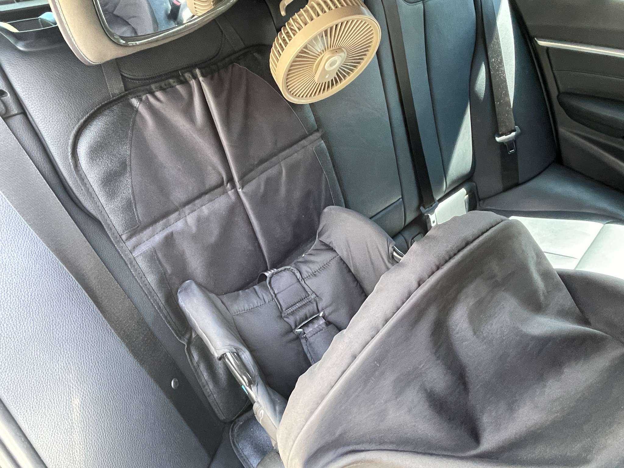 ちなみにサンシェードは使わないとき、運転席と助手席の間のシート隙間に差し込んでいます。ここに収納しておくと、物の落下も防げて一石二鳥です。は、日差しをしっかりカット。ベビーカーにも使える2WAYタイプで、折りたためばとてもコンパクトになります