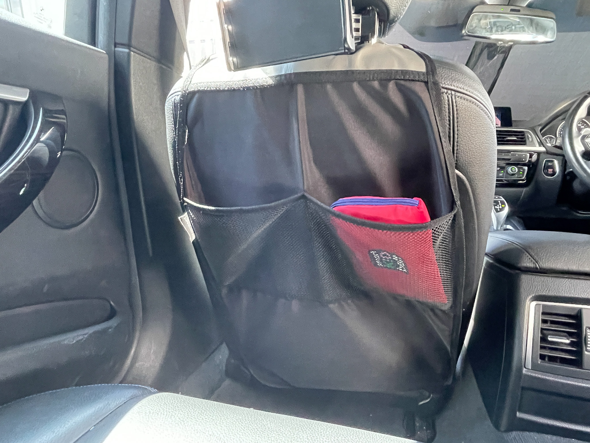 シートの背もたれに吊り下げ収納を取り付けて、おもちゃや絵本などを出し入れしやすく