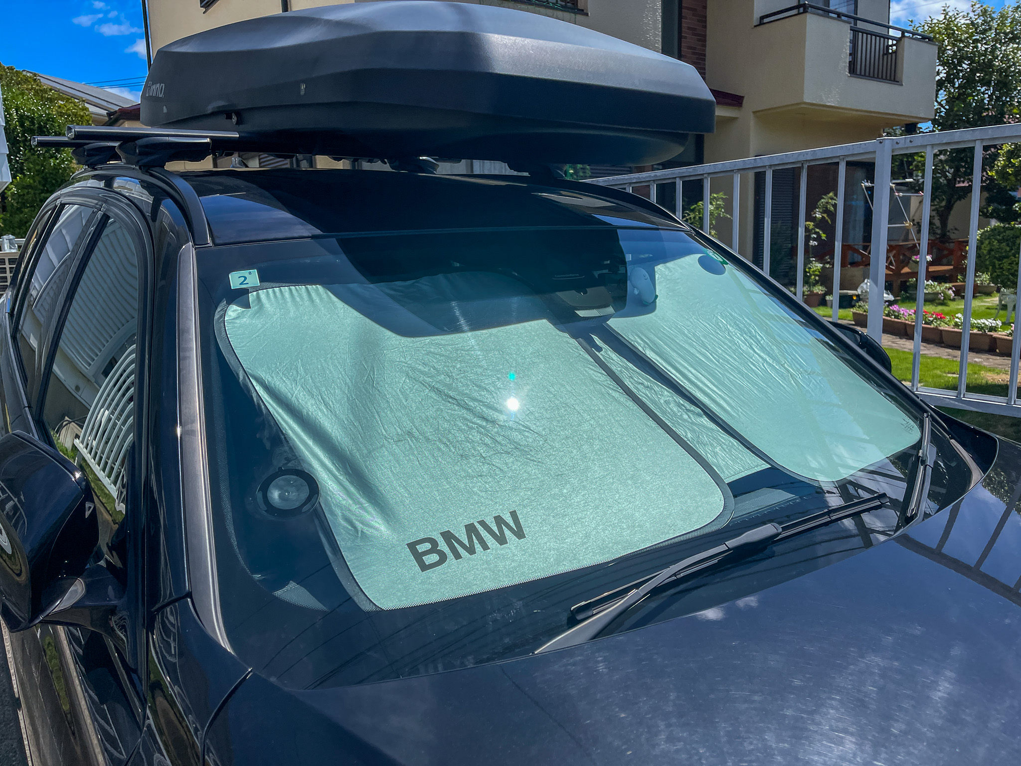 フロントガラス用のサンシェードもあると便利です。私はBMWのノベルティを使っていますが、もし買うなら折りたためるタイプが収納しやすくておすすめ。