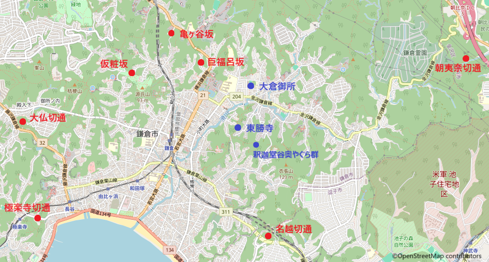 ①朝夷奈切通 ②名越切通 ③亀ヶ谷坂 ④巨福呂坂 ⑤仮粧坂 ⑥大仏切通 ⑦極楽寺切通