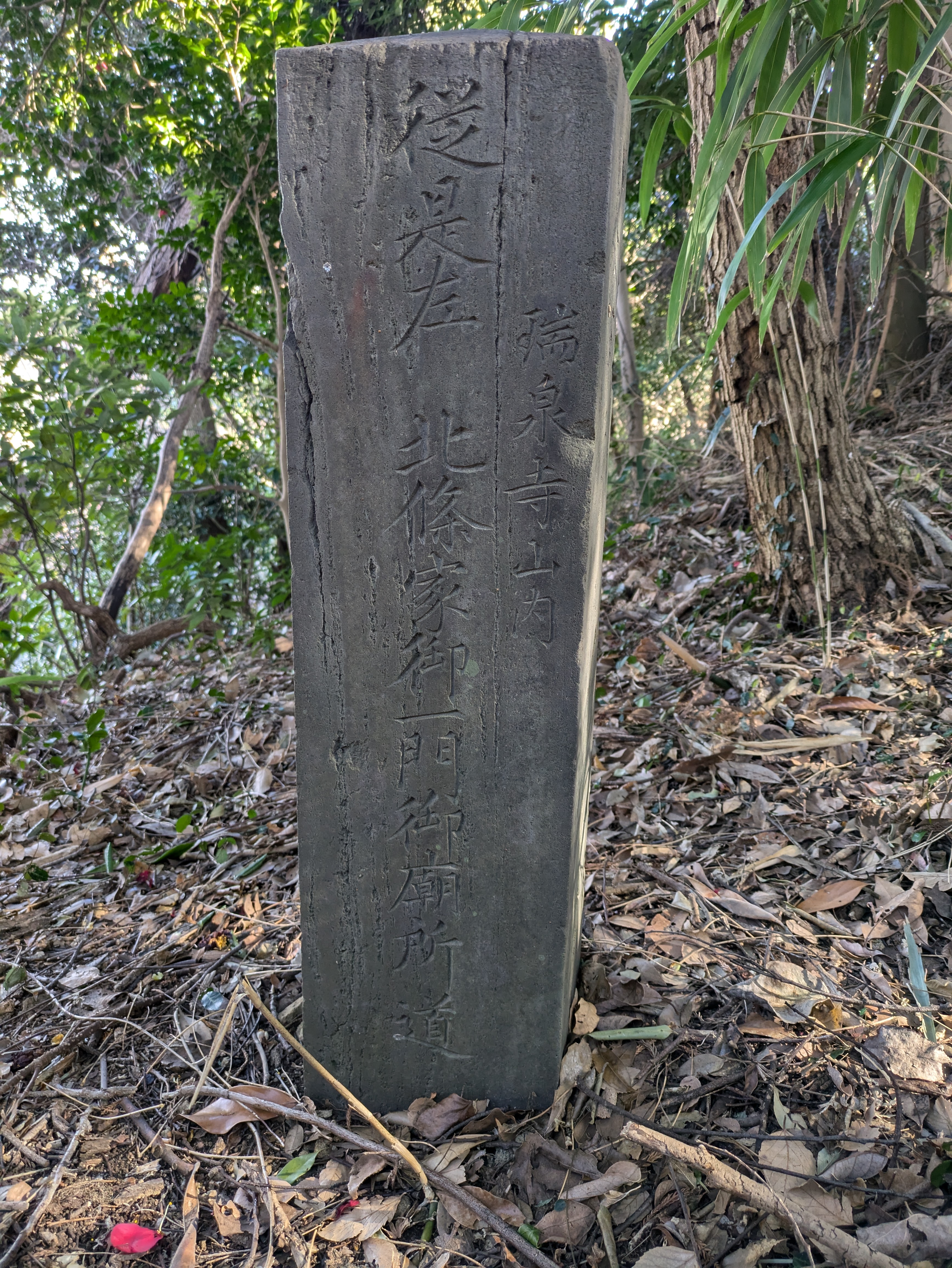 瑞泉寺裏山やぐら群の先を進むと「北条家御一門御廟所」があります。鎌倉幕府の執権であった北条氏一族を祀る墓所とされており、北条首やぐらともいわれています。御廟所につながる道には、文政12年(1829年)正月に建てられた「従是左 北條家御一門御廟所道」という道標石が残っています。(従是右~もありますが、途中まで埋まっています)