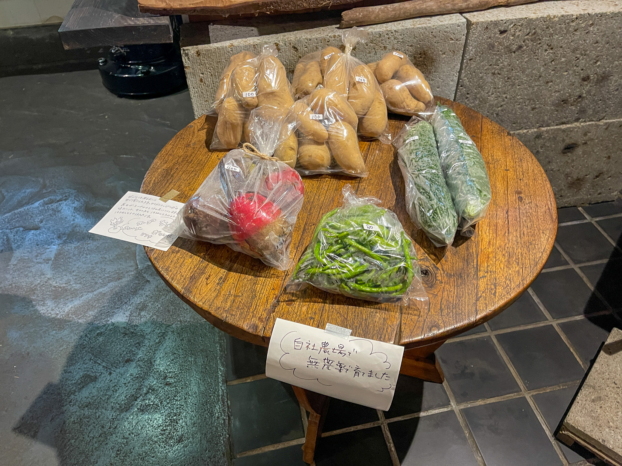 手前側は地元のお店の商品が並ぶ販売スペースになっていて、新鮮な野菜やお菓子などが購入できます。