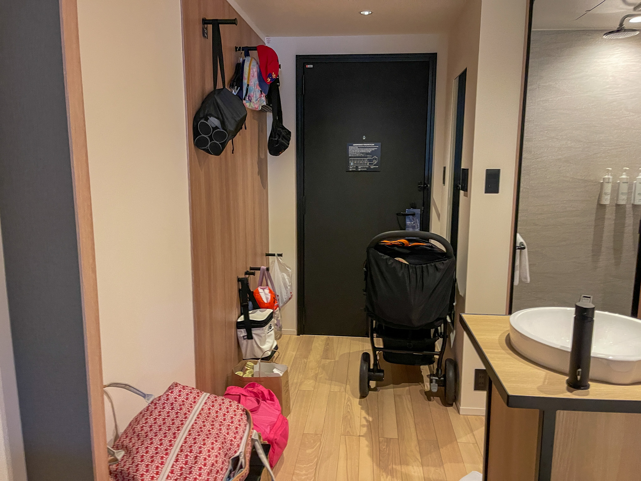 吊るすタイプの収納が多く、衣類やバッグを整理しやすかったです。限られた空間を有効に使える設計は子連れにはありがたいですね。