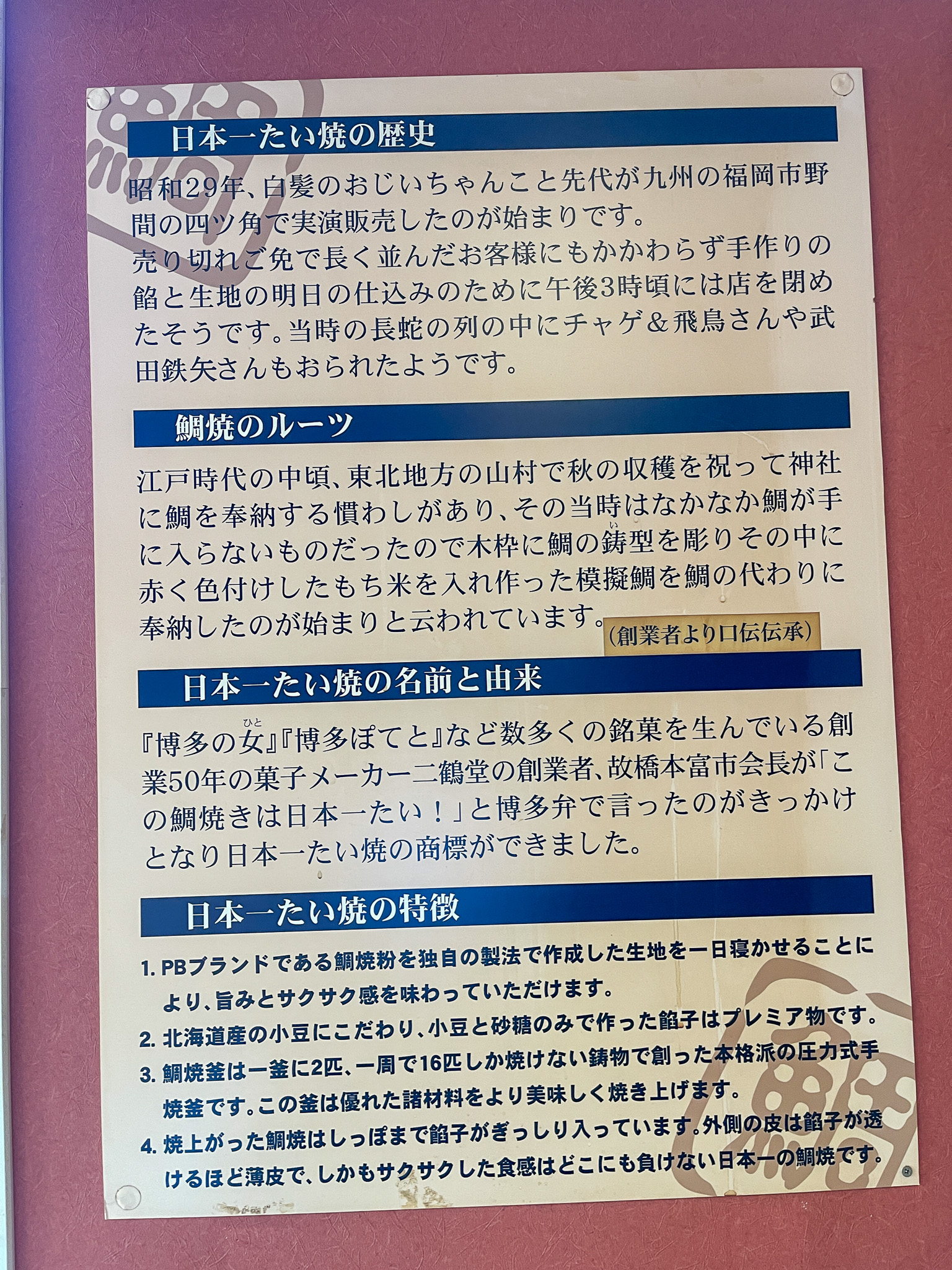 たい焼きのルーツや、どんな想いでこのお店が作られたのかなど、ストーリー性がたっぷり。創業者の写真やメッセージもあり、「たい焼きで日本一を目指す」という熱量が伝わってきます。