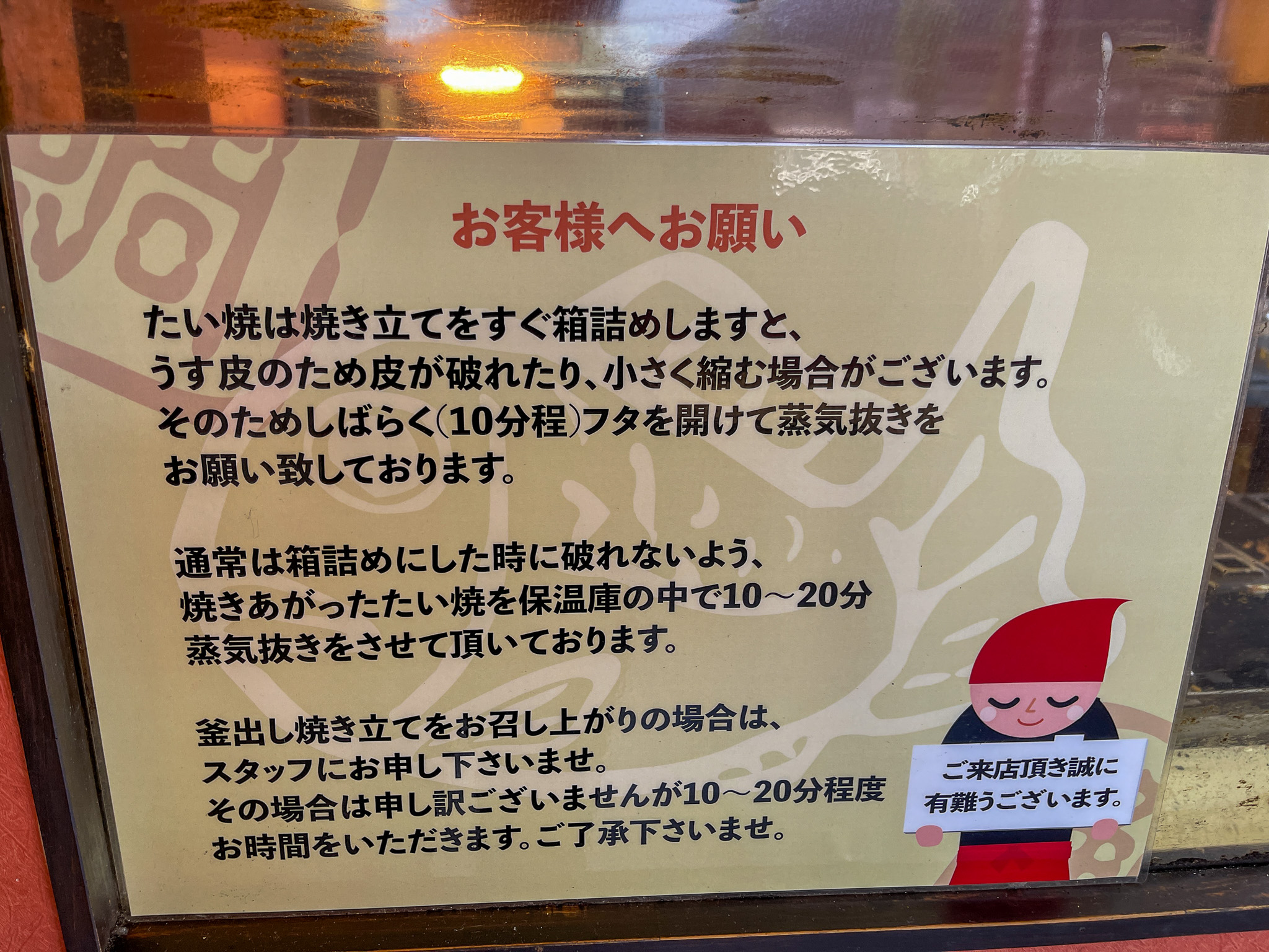 こういう一言があるだけで、「急がずゆっくり待とう」とこちらも心の準備ができますし、何よりたい焼きへのこだわりを感じます。