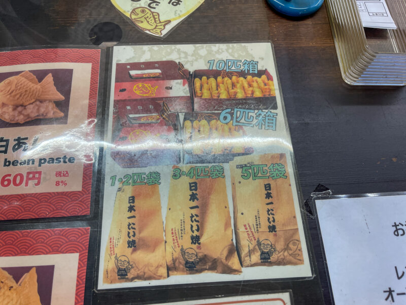 たい焼きは袋入りのほか、6匹・10匹入りの箱も用意されていて、差し入れやお土産にもぴったり。箱にはお店のロゴが入っていて、開けた瞬間テンションが上がりそうでした。