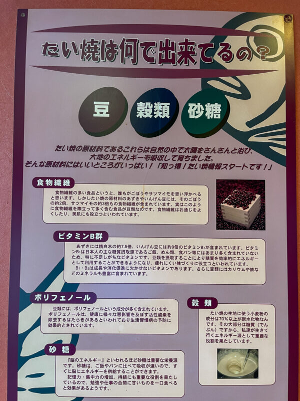 - たい焼きの歴史や栄養のパネルがあり、ちょっとしたミュージアム気分を味わえる