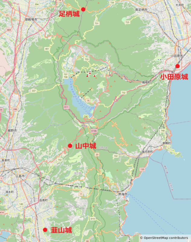 →足柄城・山中城・韮山城は、伊豆・駿河より相模に入る街道を押さえる主要城砦として位置づけられ、足柄城は小田原城の西側を守る防衛線の1つとして機能することが期待されました。