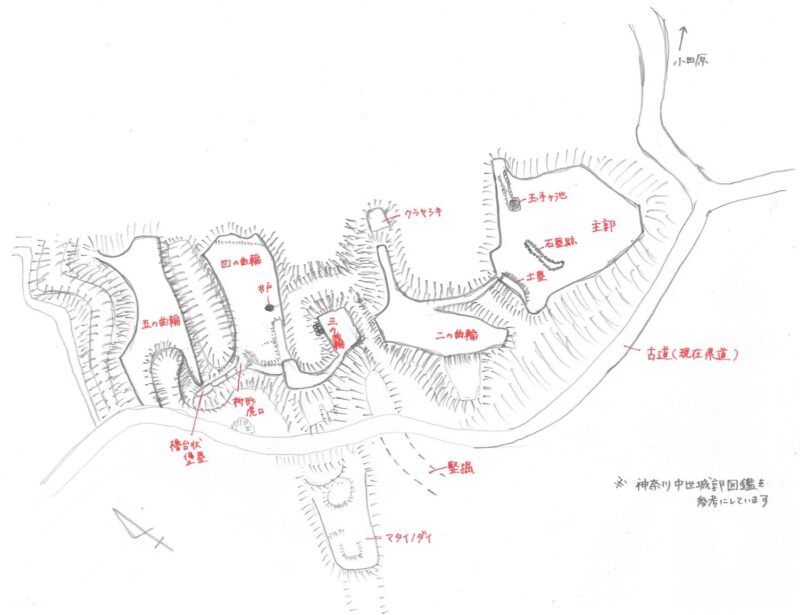 →つまり、駿河側から来た敵を五の曲輪と四の曲輪で迎え撃ち、もしこの2つの曲輪が持ちこたえられない場合は、少数の城兵が時間を稼いで主力を撤退させるといった戦い方を後北条氏が想定していたとも考えられるようです。