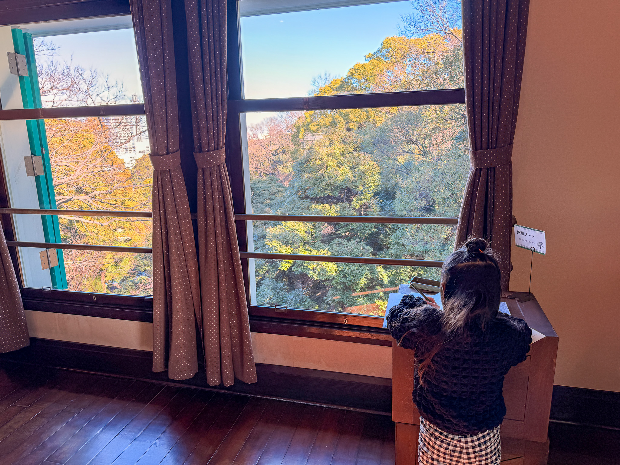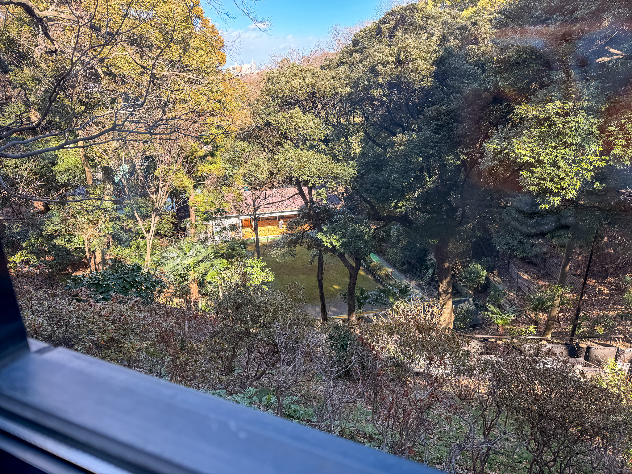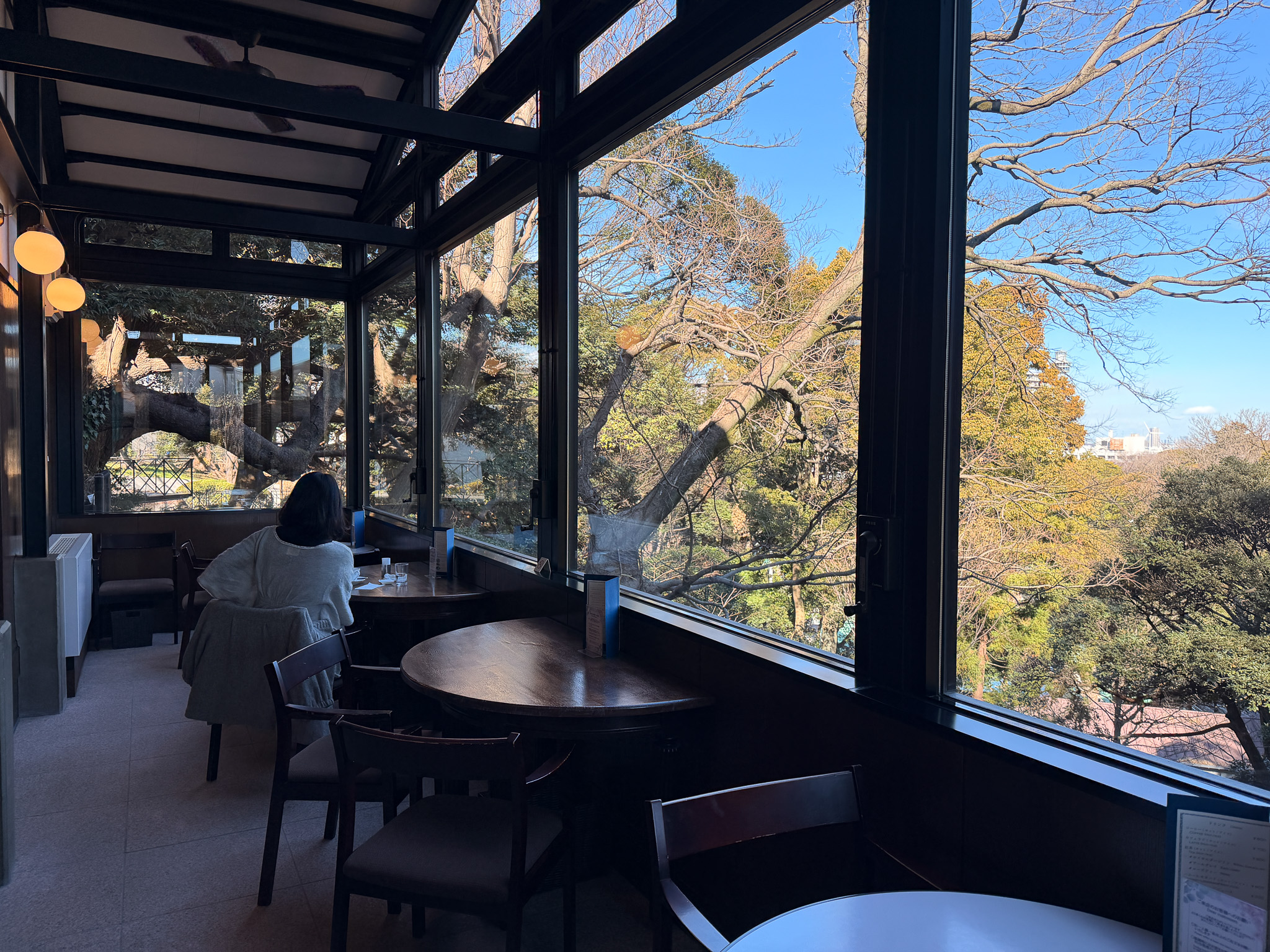 窓際の席に座ると、目の前には元町公園の豊かな緑が広がります。 木々の間からは、公園内にある「弓道場」が見え、静寂の中に響く弦の音や、練習に励む人たちの凛とした姿が遠目に見えることも。