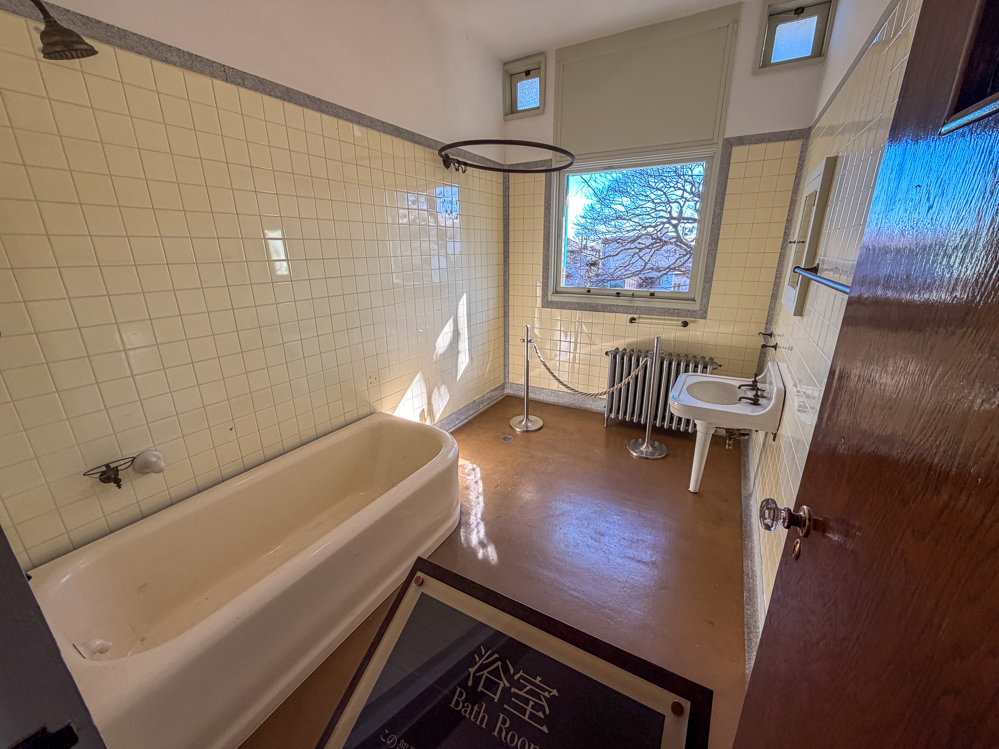 どっしりとした白い浴槽とタイルの色のコントラストが、いかにも「古き良きハイカラな暮らし」といった雰囲気を醸し出しています。 窓の外には冬の木々が見え、当時はどんな気持ちでここでお風呂に入っていたのかな、なんて想像が膨らみます。
