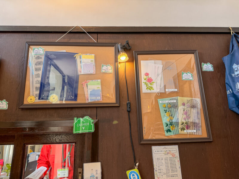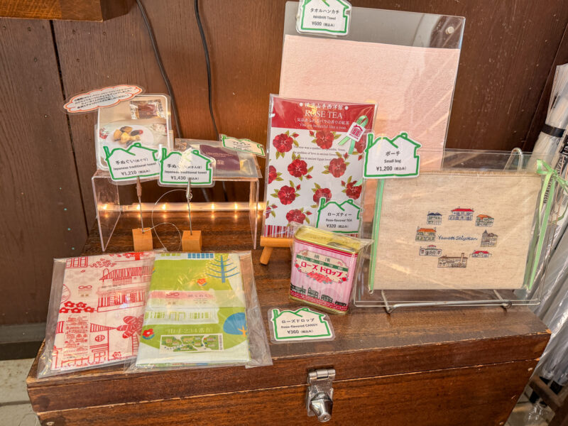 見学の最後には、玄関近くにあるお土産コーナーをチェック。 横浜山手といえば「バラ」がシンボルですよね。 ここでもバラをモチーフにした素敵なアイテムがたくさん揃っていました。