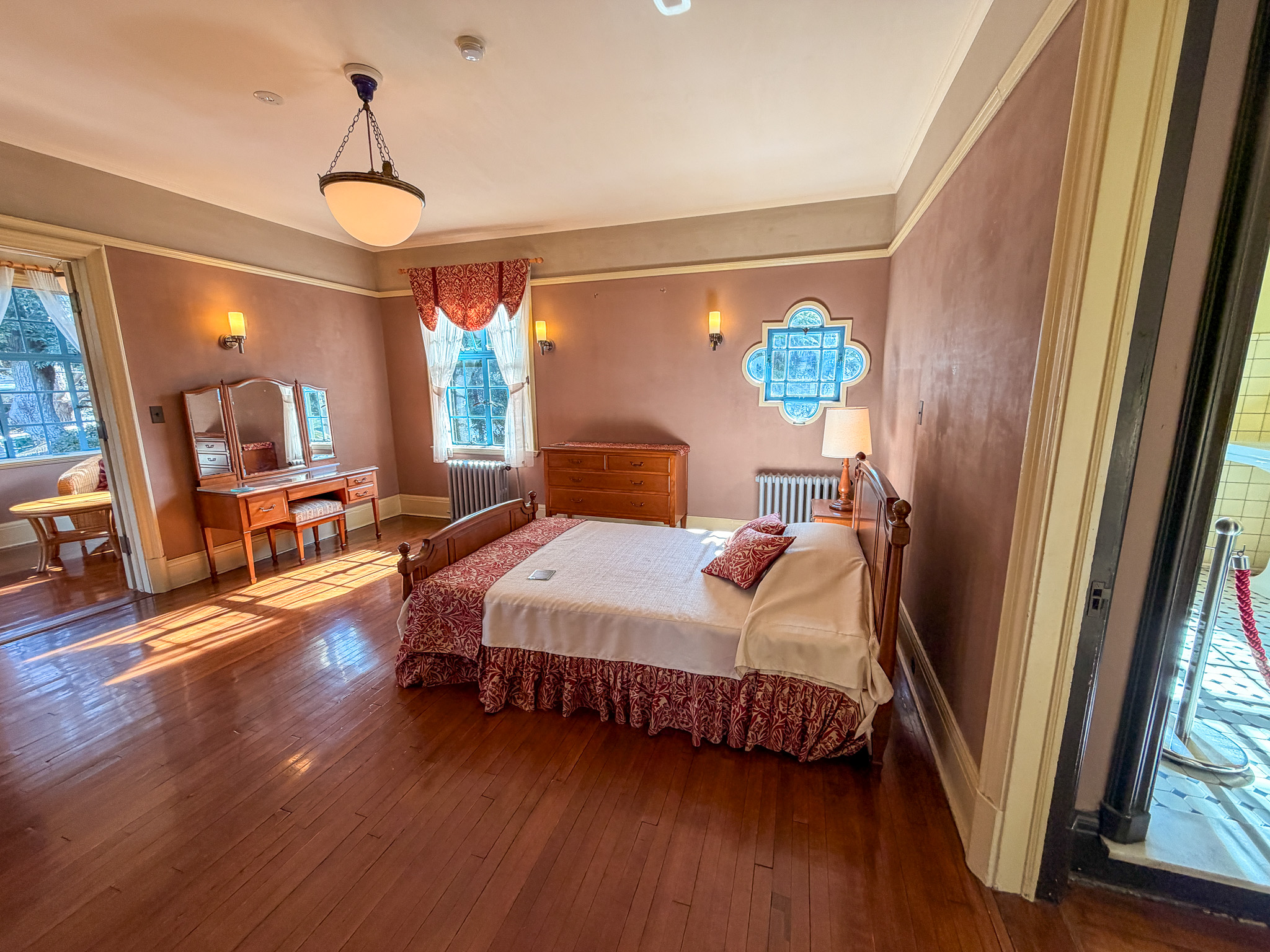 さらに驚いたのが、窓の格子まで浴槽と同じ色に揃えられていること。デザインの統一感が素晴らしく、真ん中に大きな窓がどんと配置されたデザインもとてもオシャレ。この窓から差し込む光が水面に反射する様子を想像するだけで、当時の優雅な暮らしが目に浮かぶようでした。