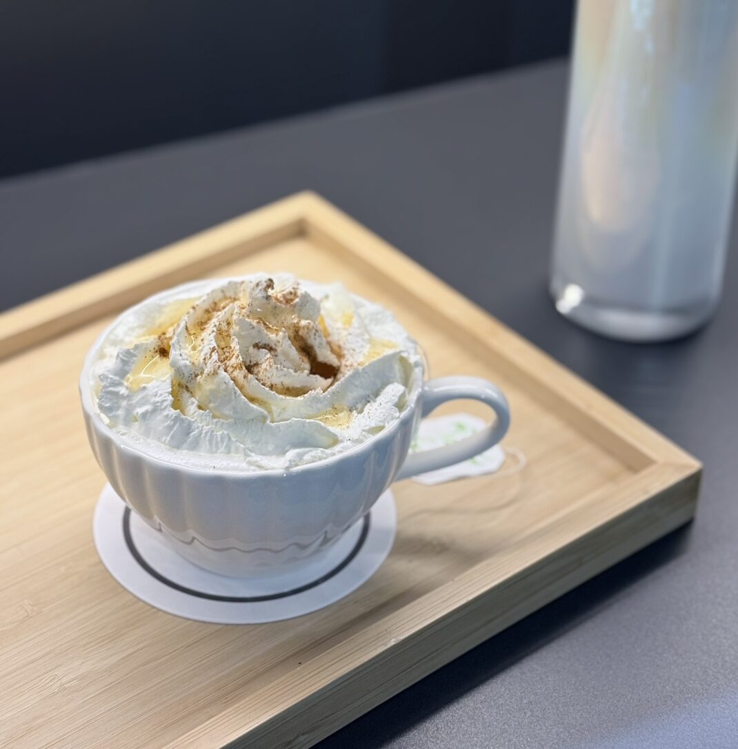 リラックス効果のあるカモミールティーラテにホイップとちみつ、シナモンをトッピングした贅沢な1杯はいかがでしょうか。