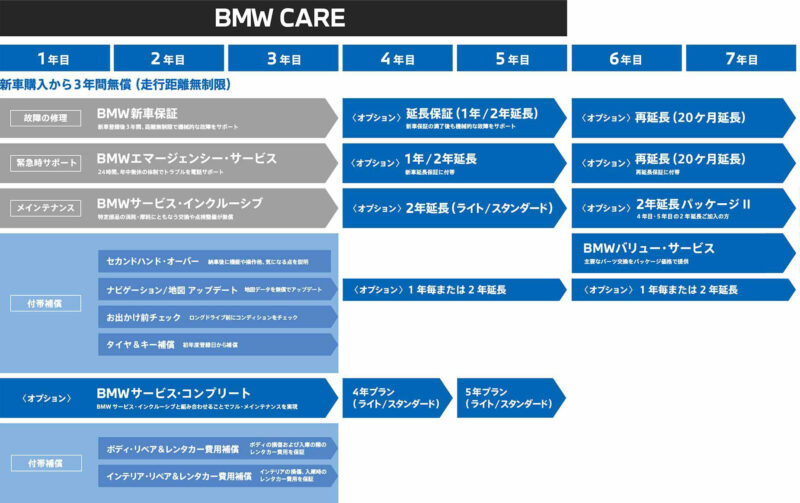 先程ご紹介した【BMW CARE】はどれをお選びいただいても基本プランで付帯されています。