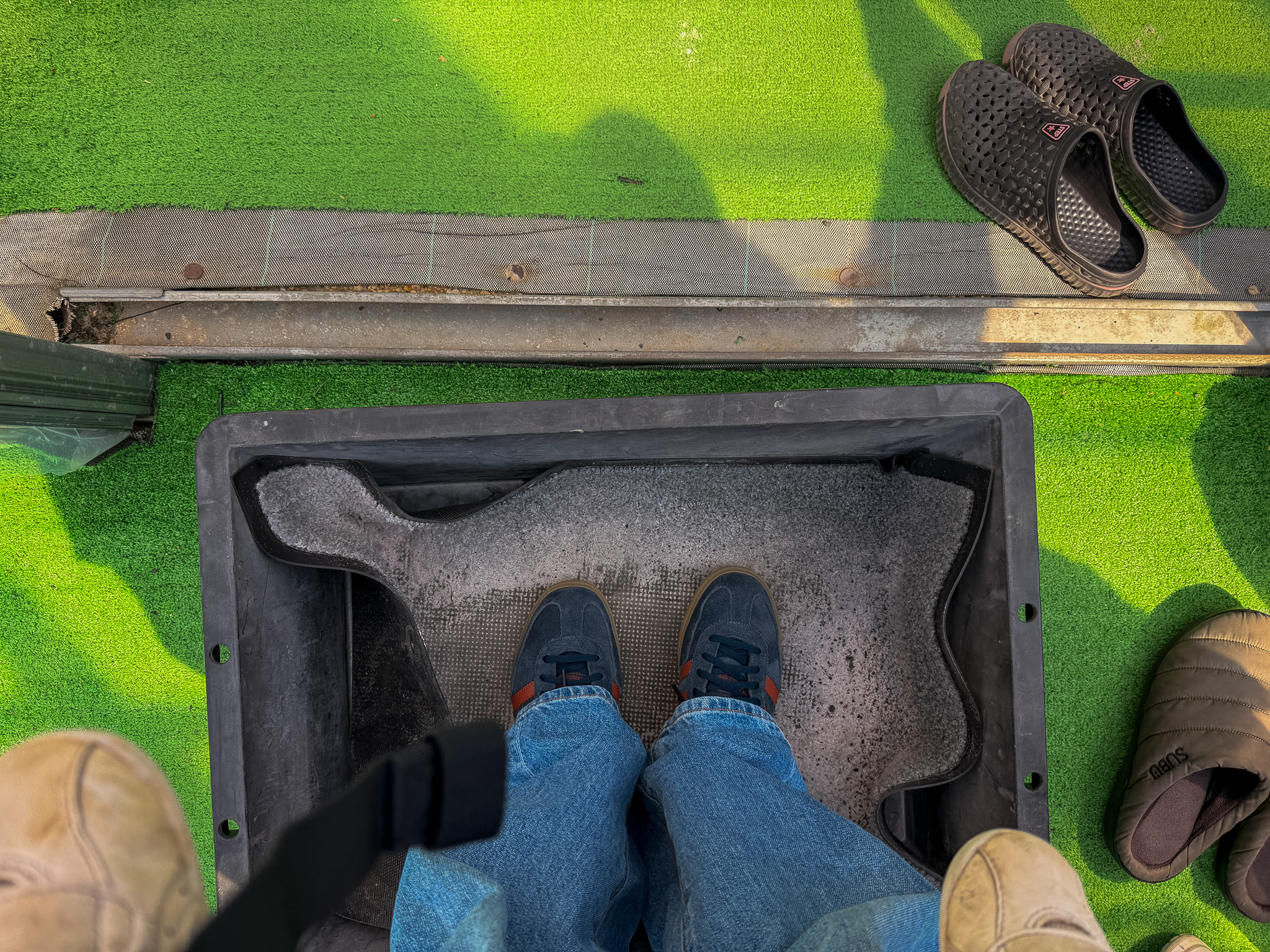 ハウスに入る前には、靴の消毒をしてから入場します。