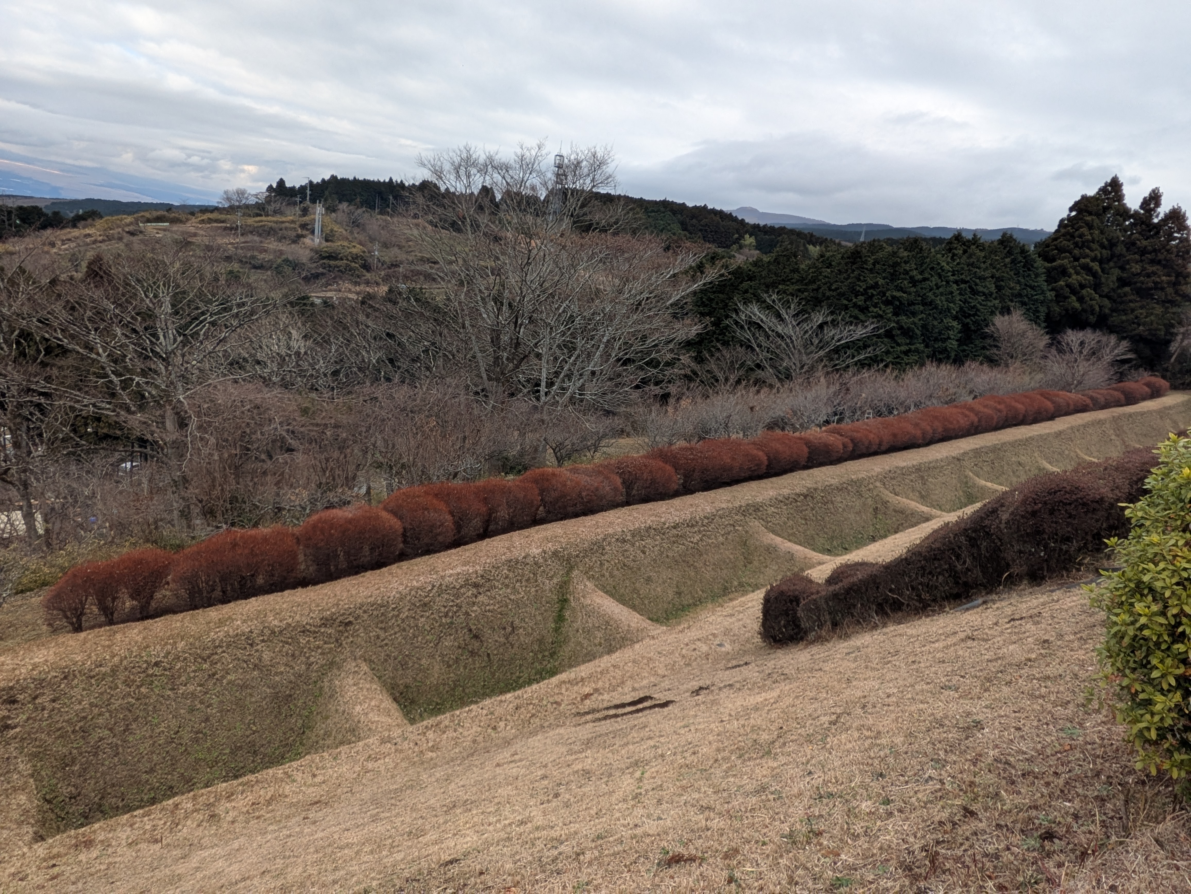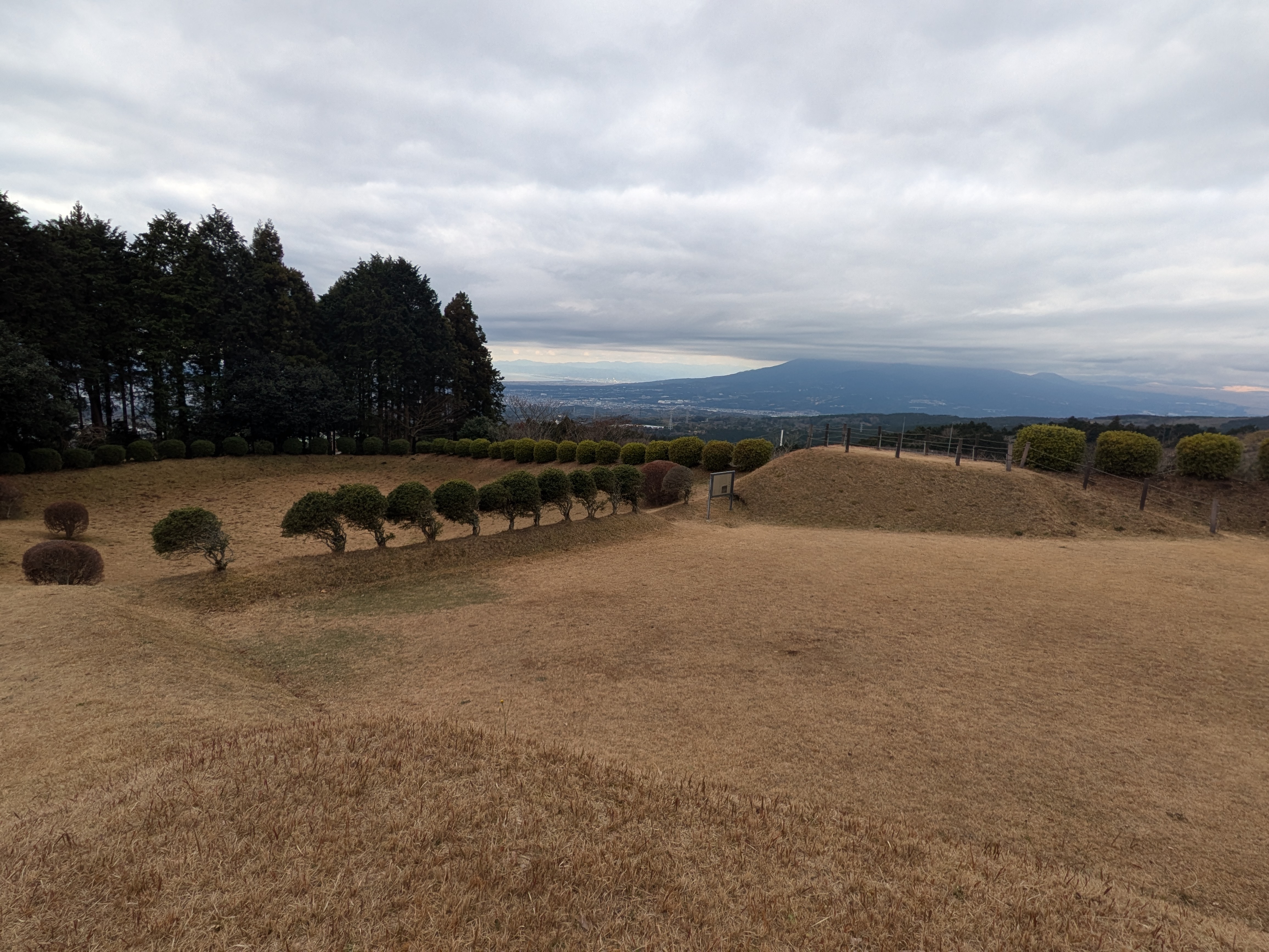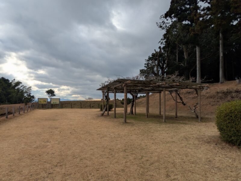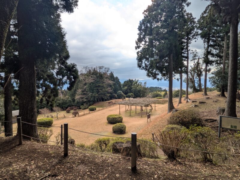 ↑左奥がすり鉢曲輪で、右奥の高くなっている部分が見張り台になっています。すり鉢曲輪は岱崎出丸の最先端を守る曲輪で、中央部がへこんでいて土塁までゆるやかにたちあがっている様子から名付けられています。見張り台は土塁上の角を広げてつくられており、三島・沼津方面から韮山城まで見ることができます。