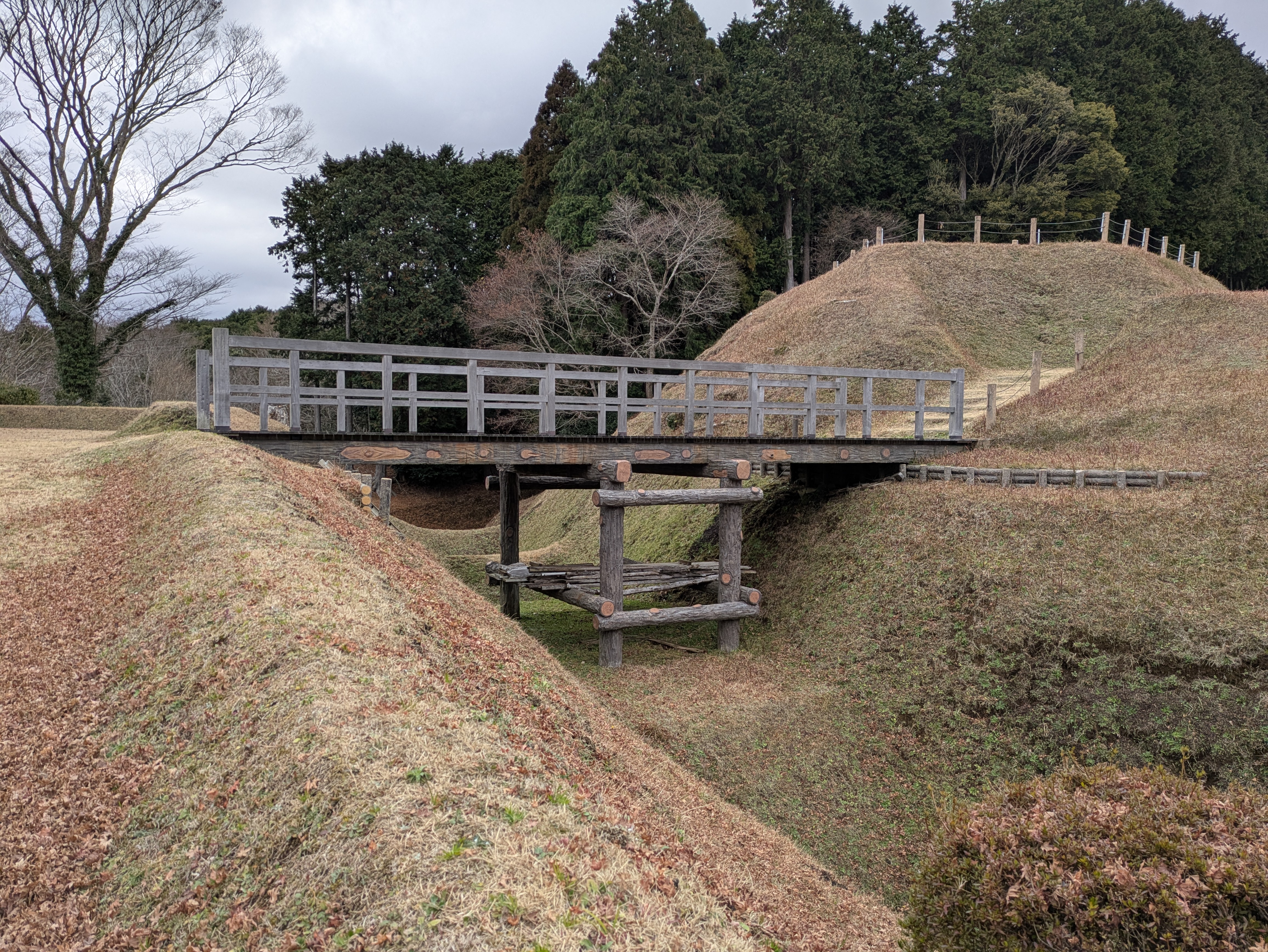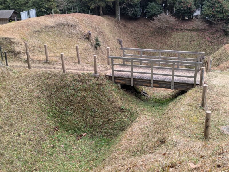 ↑本丸(左側)との間の橋で、土橋と木橋が組み合わさったものになっています。本丸側は掘り残した土橋で、途中から木橋となって二ノ丸に続いていますが、こうすることで二ノ丸から敵が侵入してきた場合、木橋を破壊することで本丸への侵入を防ぐことができます。