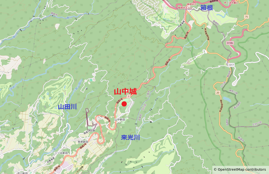 山中城は静岡県三島市にある後北条氏のお城で、静岡県と神奈川県の境にある箱根山の西麓の標高約580mに築かれています。城は丘陵にあり、東から南側にかけては来光川によって形成された急峻なV字状の谷で、西側は山田川によって複雑な谷の地形となっており、要害の地に築かれていました。