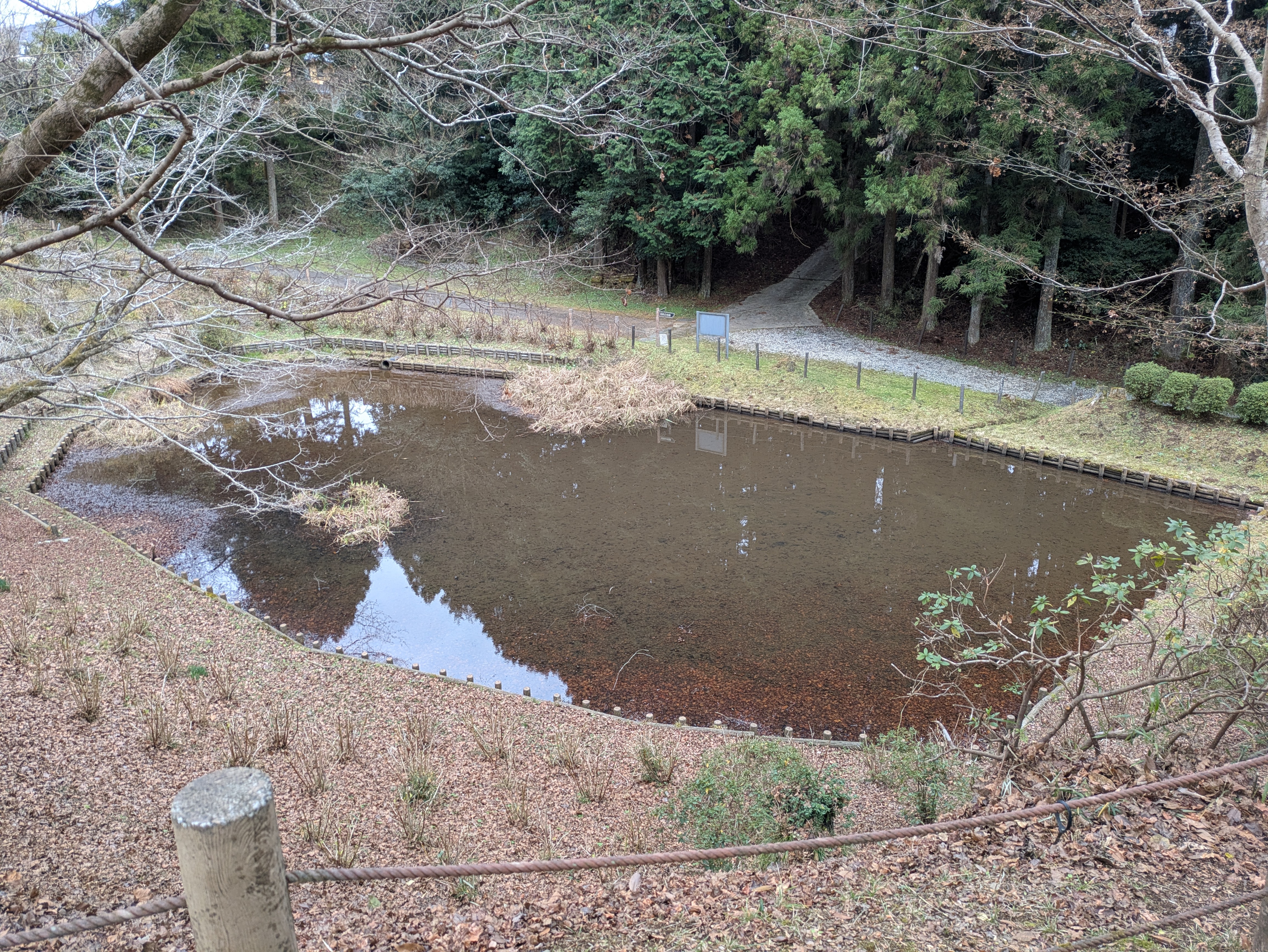 箱井戸と田尻の池はともに貯水池であり、2つの池の間は土塁によって区切られ、排水路によって箱井戸の水が一段下がった田尻の池に流れるようになっています。これは水の腐敗などを防ぐ工夫と考えられ、箱井戸の水を飲料水としていたとみられます。(写真は箱井戸)