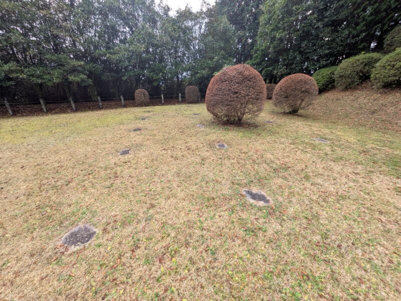 山中城で見つかっている建物跡は、兵糧庫跡の礎石建物、西櫓の掘立柱建物、元西櫓の礎石建物の3棟のみで、戦後の開墾などの影響で建物の遺構が破壊され、他に建物があったか確認できなくなってしまったようです。
