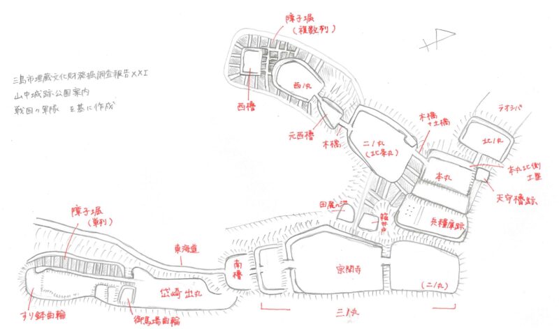 山中城は、本丸を基点として放射状に分岐した3本の尾根を利用して曲輪が配置されている変則的な連郭式山城で、全体的にはU字になっています。